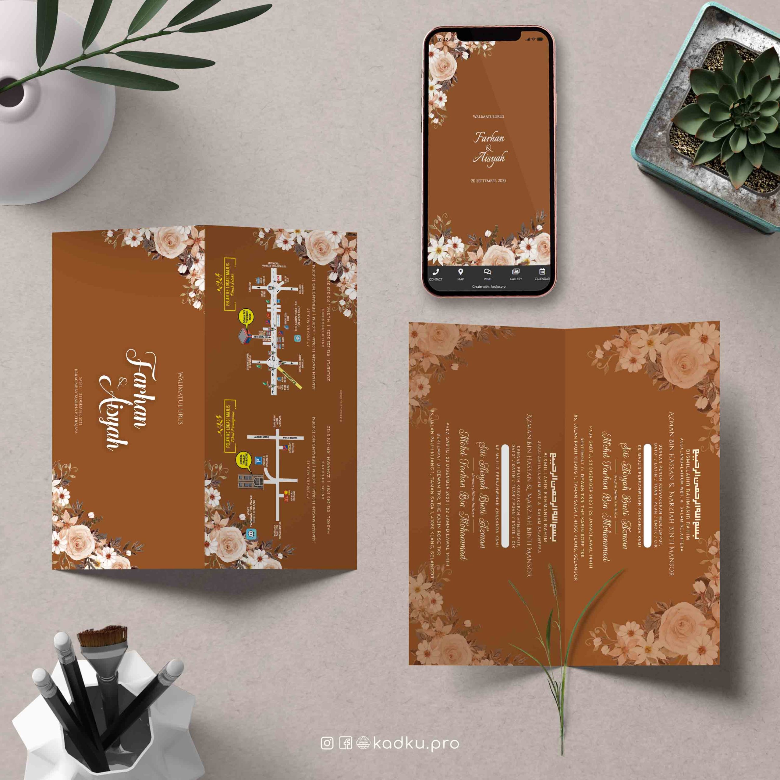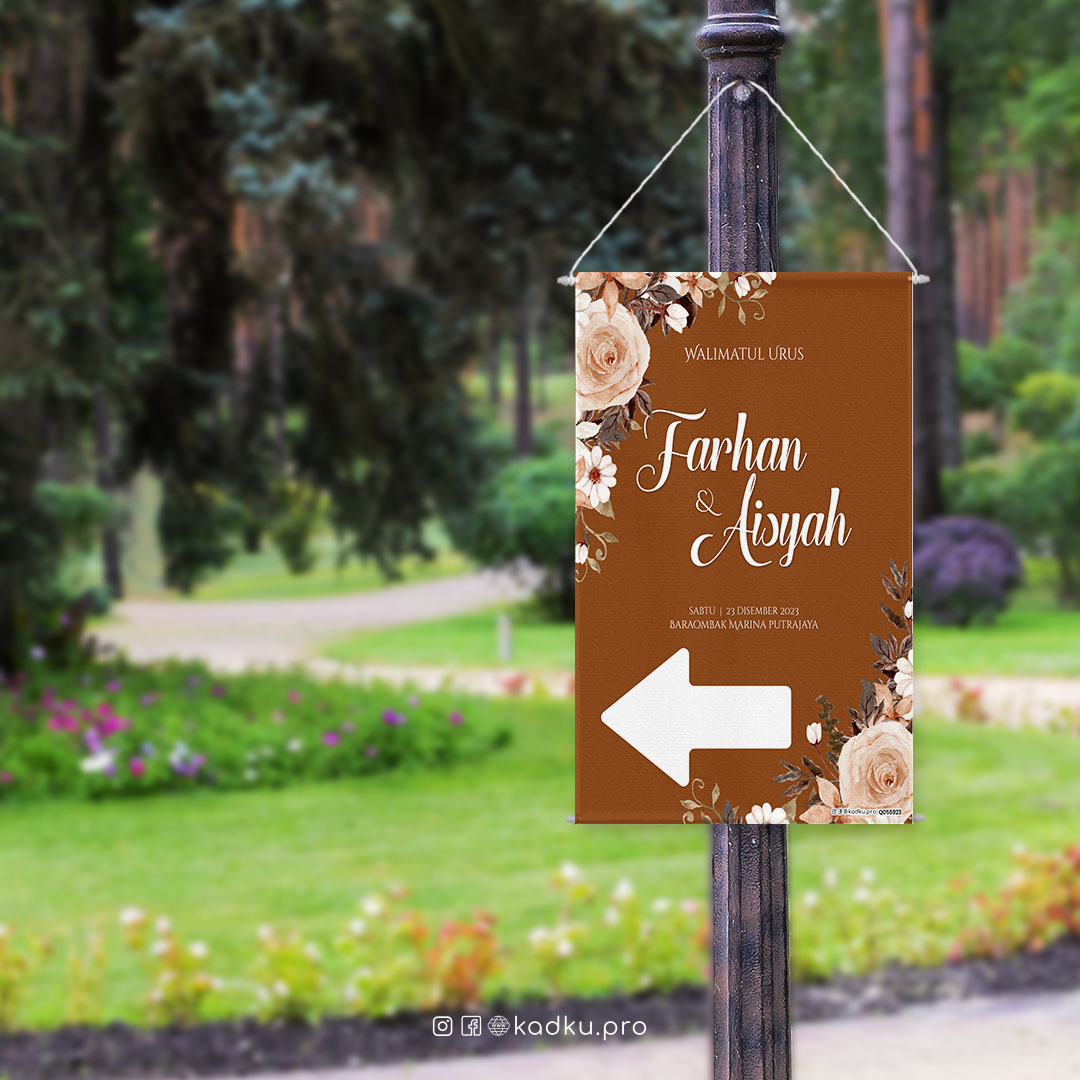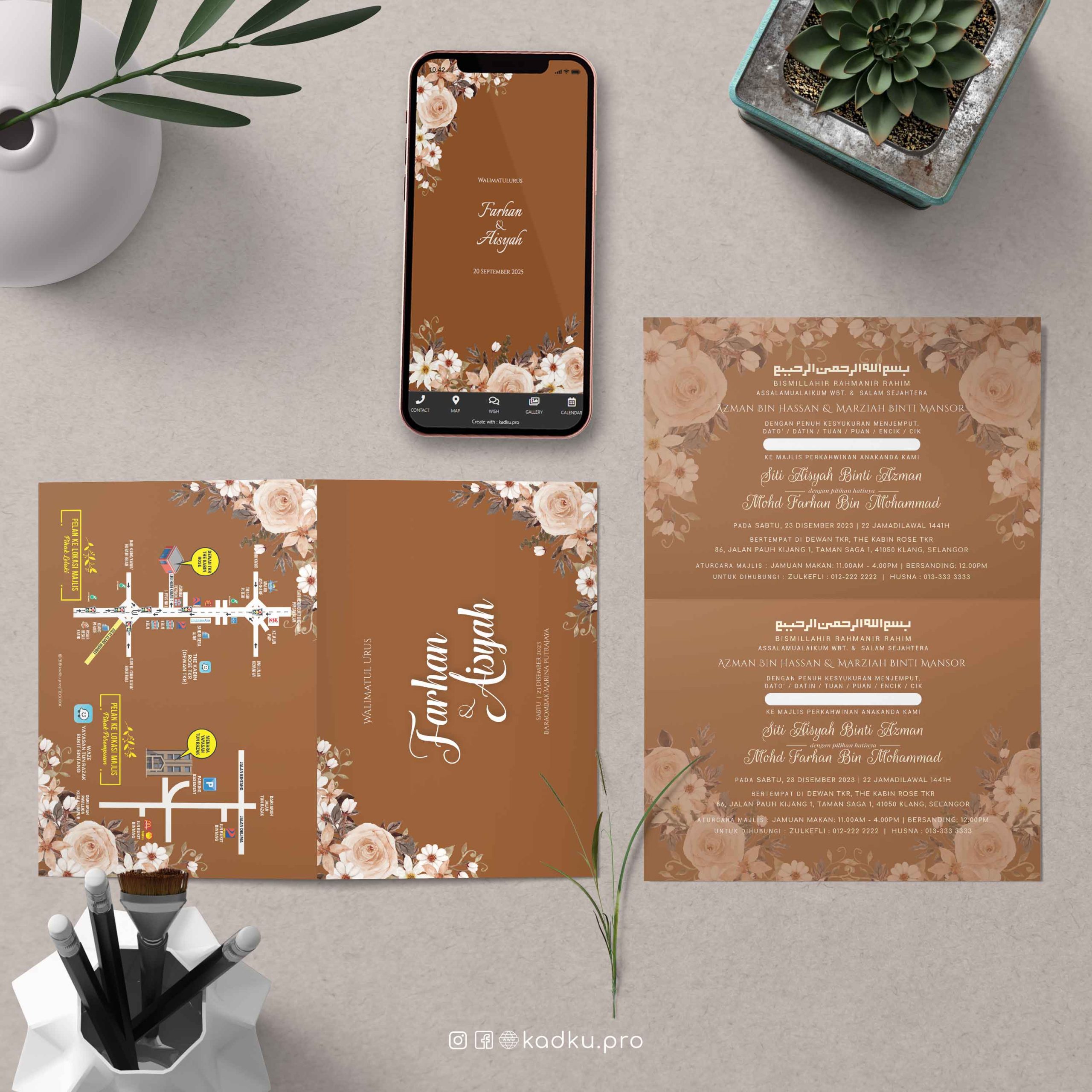 Elemen floral klasik (ros dan bunga putih) yang terlihat eksklusif. Background bertemakan warna coklat keperangan.